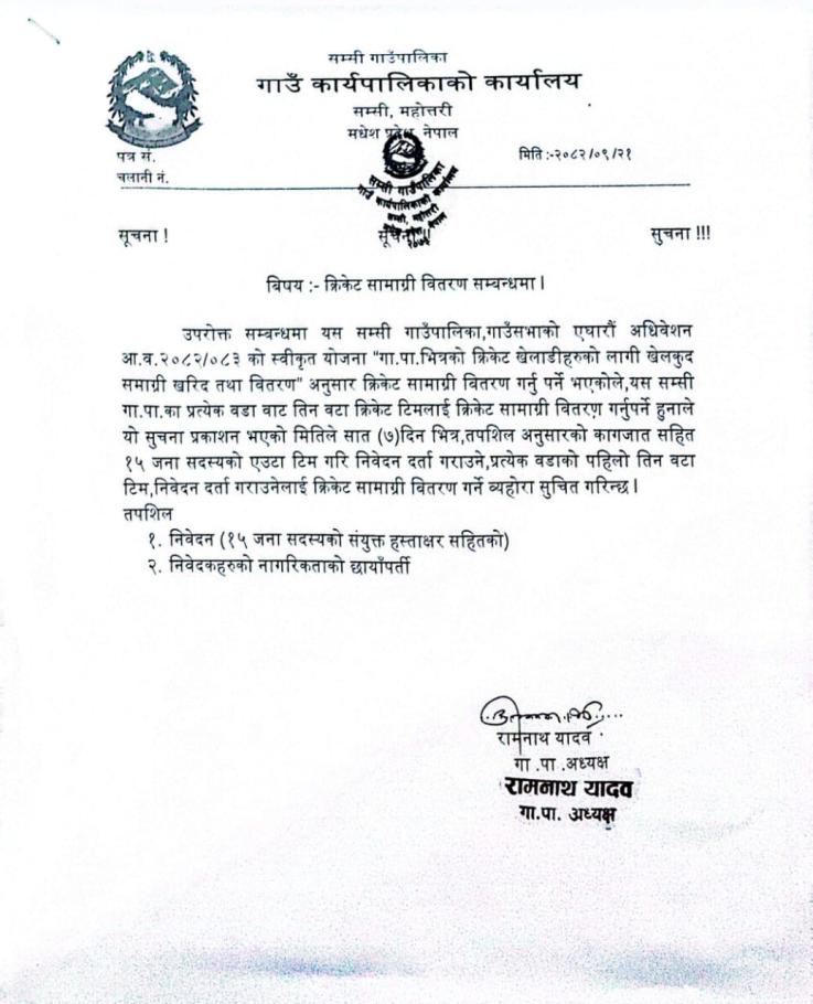 » क्रिकेट सामग्री वितरण सम्बन्धमा