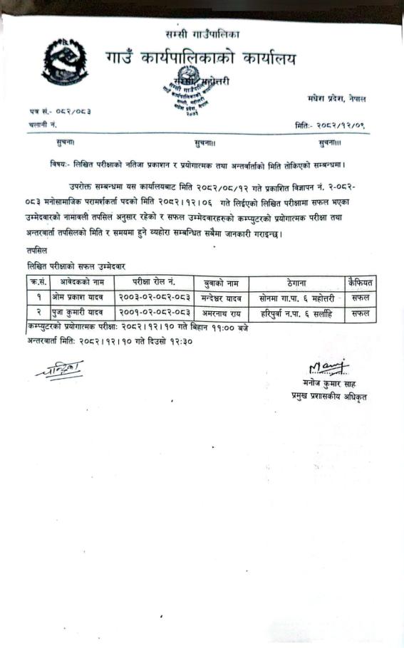 लिखित परीक्षाको नतिजा प्रकाशन र प्रयोगात्मक तथा अन्तर्वार्ताको मिति तोकिएको सम्बन्धमा