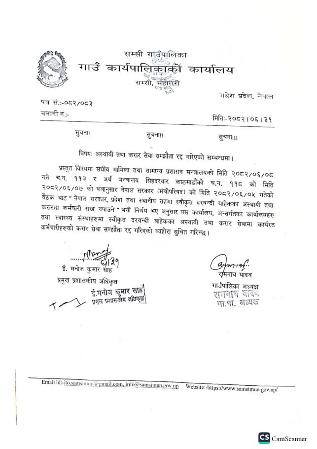 अस्थाई तथा करार सेवा सम्झौता रद्द गरिएको सम्बन्धमा