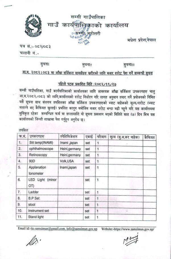 » आ.व. २०८२।०८३ मा आँखा सर्जिकल सामग्रीहरु खरीदको लागि बजार दररेट पेश गर्ने सम्बन्धी सुचना