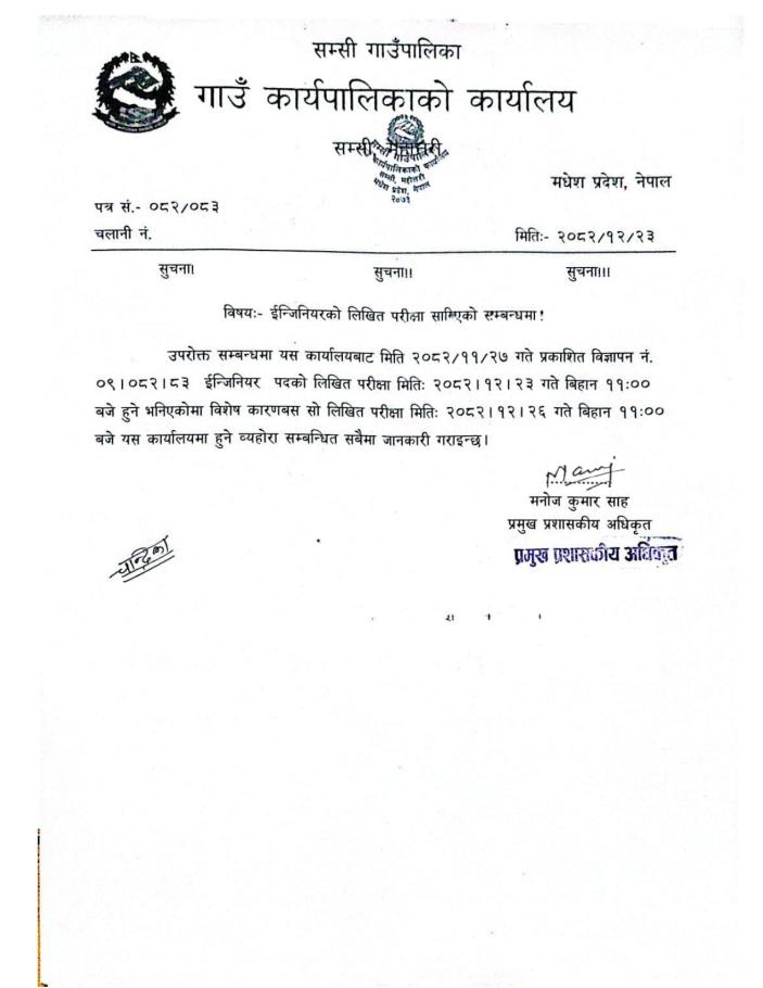 ईन्जिनियर पदको लिखित परीक्षा सरेको सम्बन्धमा