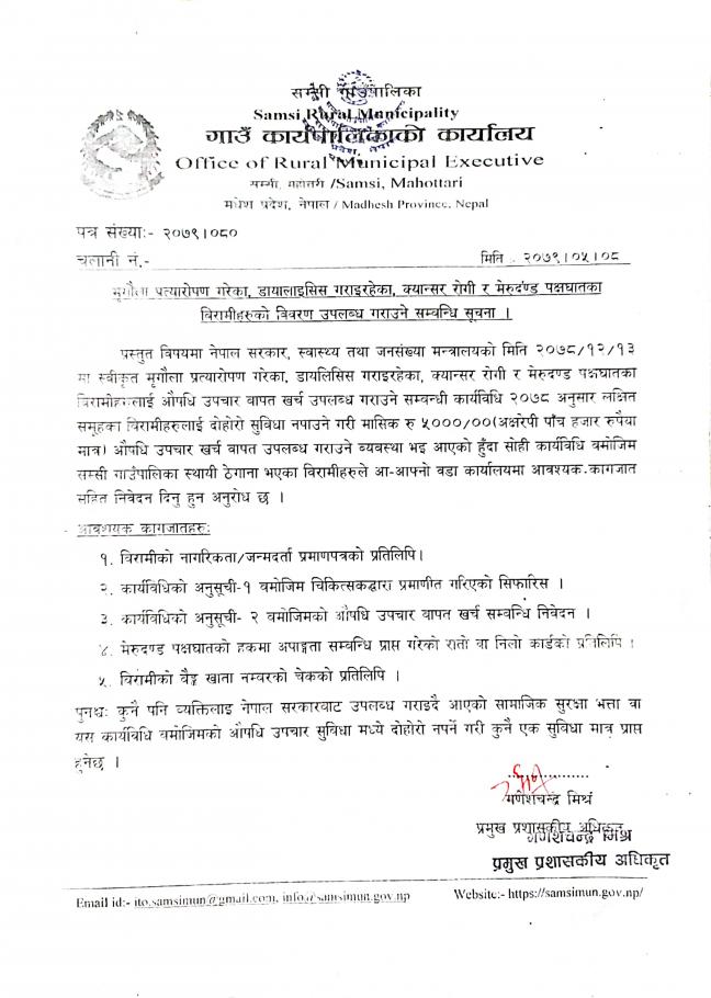 मृगौला प्रत्यारोपण गरेका, डायालाइसिस गराइरहेका, क्यान्सर रोगी र मेरुदण्ड पक्षघातका बिरामीहरुको विवरण उपलब्ध गराउने सम्बन्धि सूचना