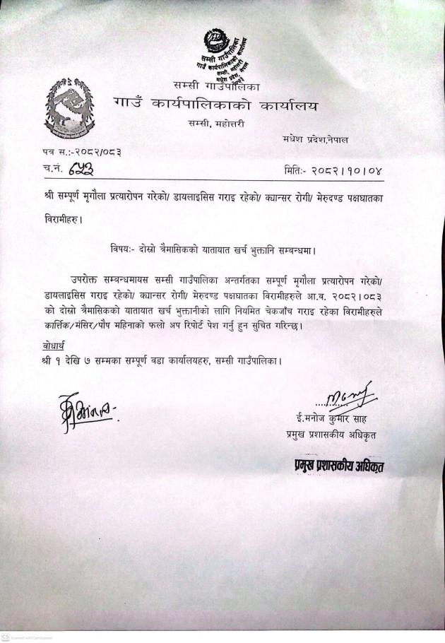मृगौला प्रत्यारोपन गरेका/ डायलाइसिस गराइरहेका/ क्यान्सर रोगी/ मेरुदण्ड पक्षाघातका विरामीहरुले दोश्रो त्रैमासिकको फलअप रिपोर्ट पेश गर्ने सम्बन्धी सुचना