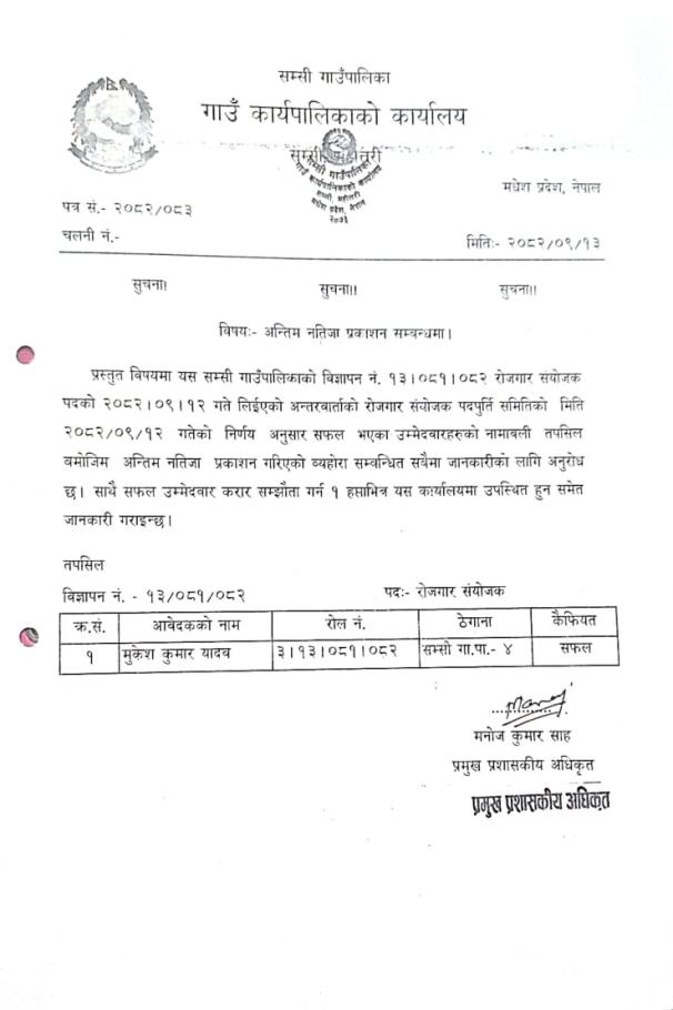 रोजगार संयोजकको अन्तिम नतिजा प्रकाशन सम्बन्धमा