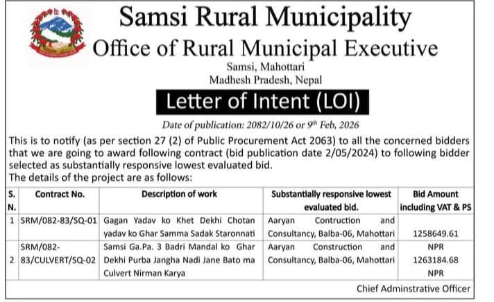 बोलपत्र स्वीकृत गर्ने आशयको सुचना